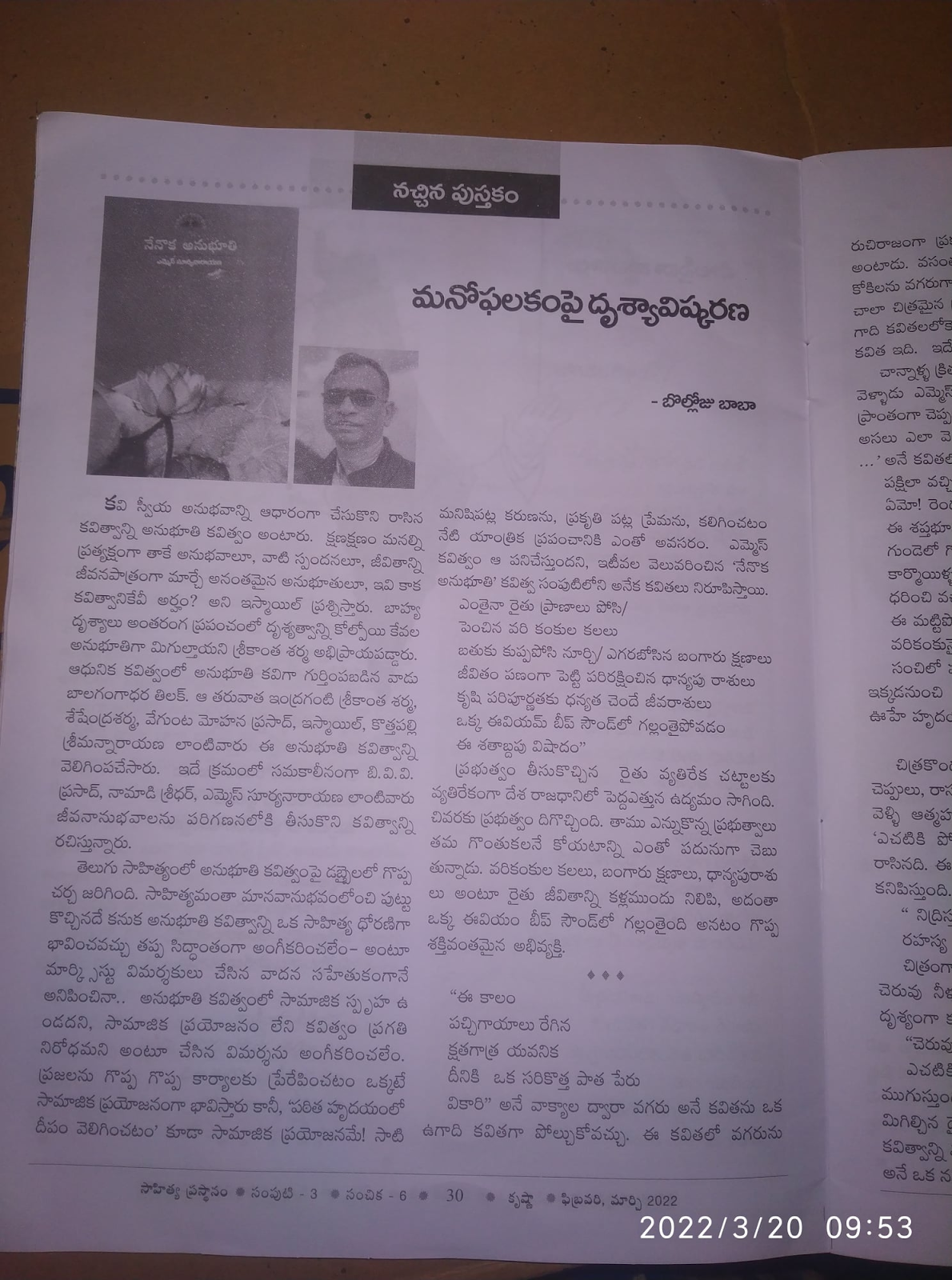 (శ్రీ ఎమ్మెస్ సూర్యనారాయణ ఇటీవల వెలువరించిన “నేనొక అనుభూతి” కవిత్వ సంపుటి పరిచయ వ్యాసం మార్చ్ 2022 ప్రస్థానం సంచికలో ప్రచురించబడింది. ఎడిటర్ గారికి కృతజ్ఞతలు)